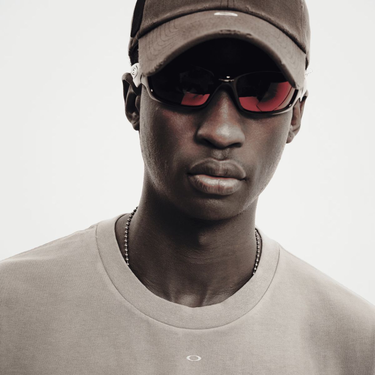 • Nano Logo em Foil: O logotipo clássico da Oakley aparece em uma escala reduzida no centro do peito, aplicado com uma técnica metalizada que reflete a luz de forma industrial.