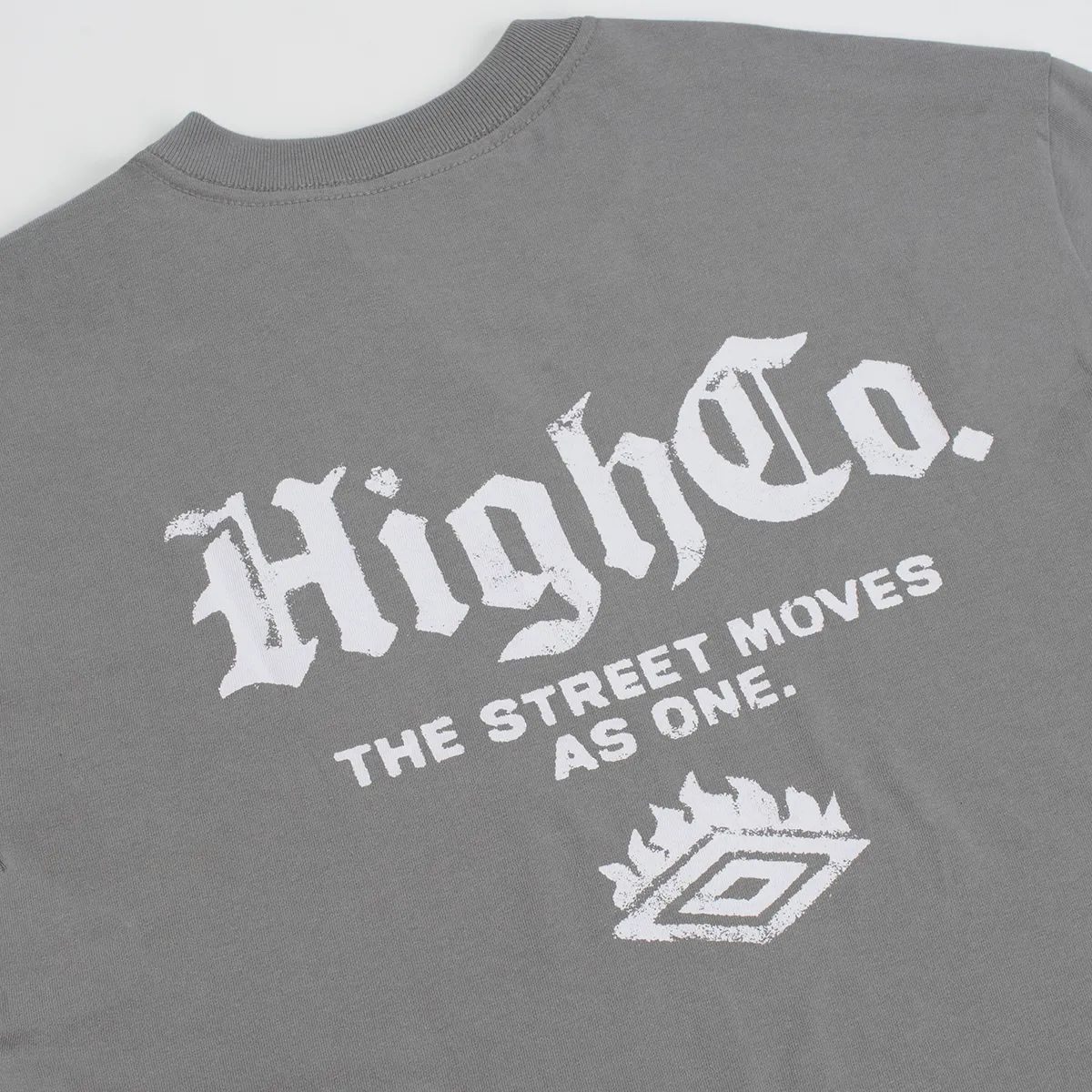 Design Street Unit: Apresenta gráficos exclusivos da collab que misturam o logótipo de diamante da Umbro com a estética visual única da High Company, focada na cena urbana.