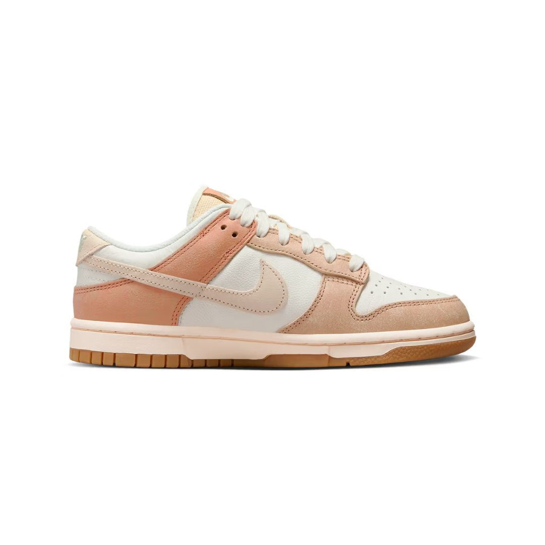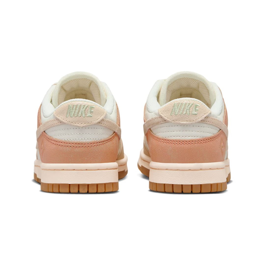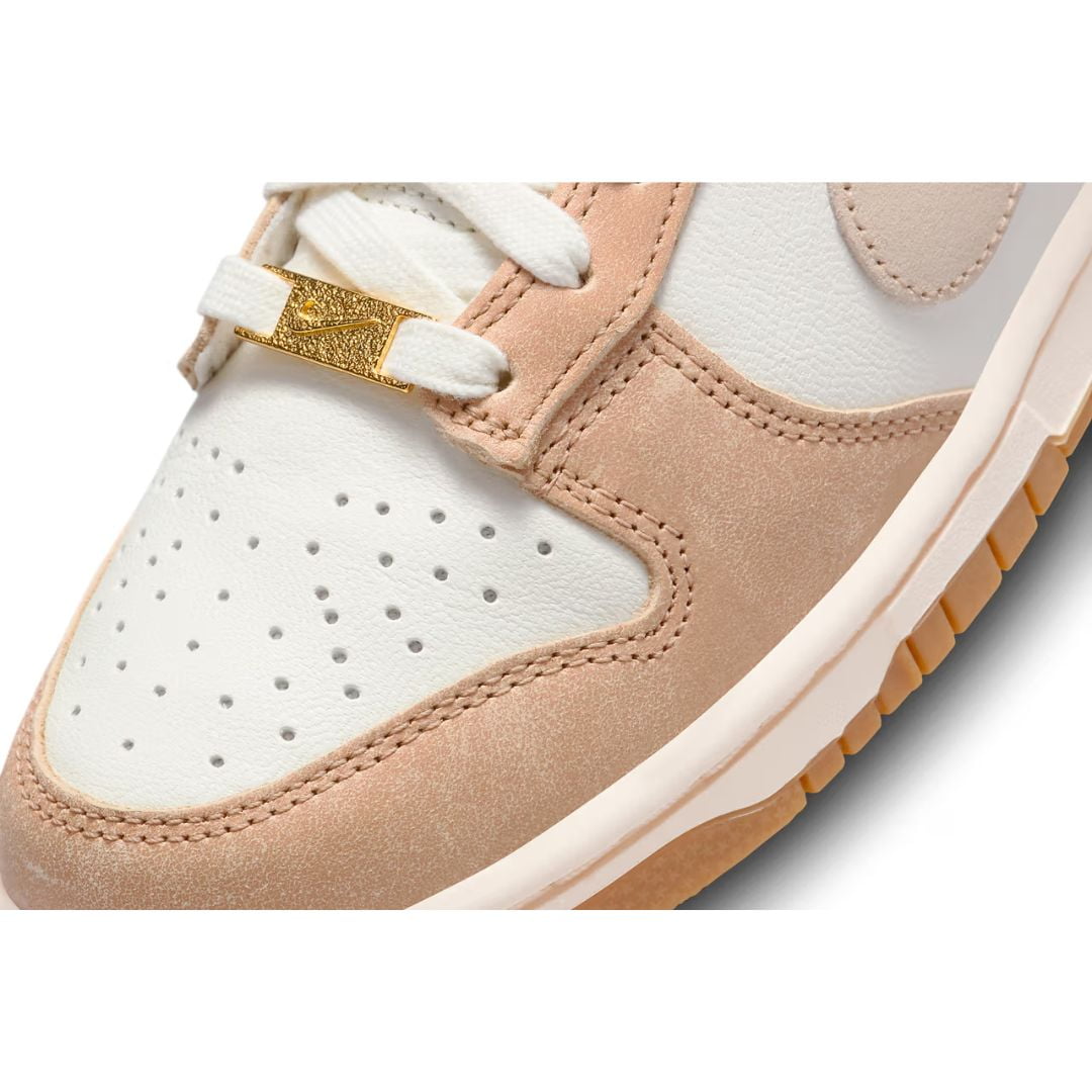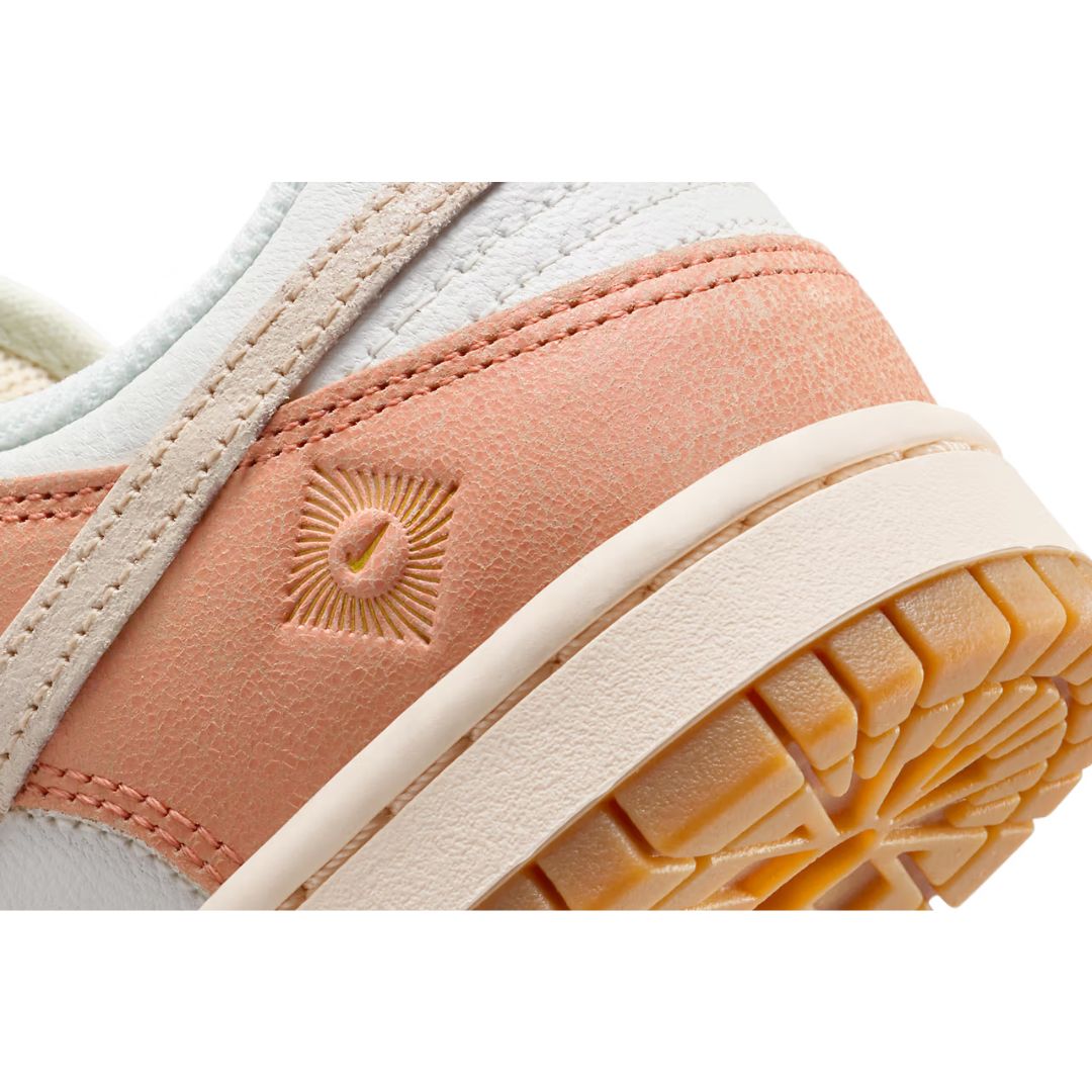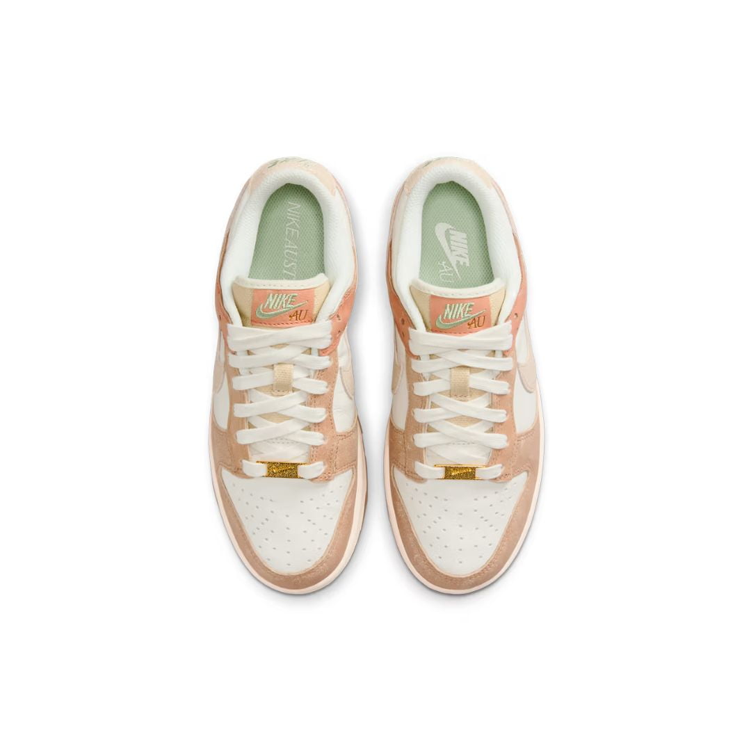 A parte superior do Dunk Low “Australia” apresenta uma paleta de cores que evoca a exuberância da terra australiana. O branco limpo e puro, juntamente com o verde suave e o amarelo vibrante, cria uma combinação única que remete às paisagens naturais deslumbrantes, à flora exótica e à vida selvagem da Austrália.