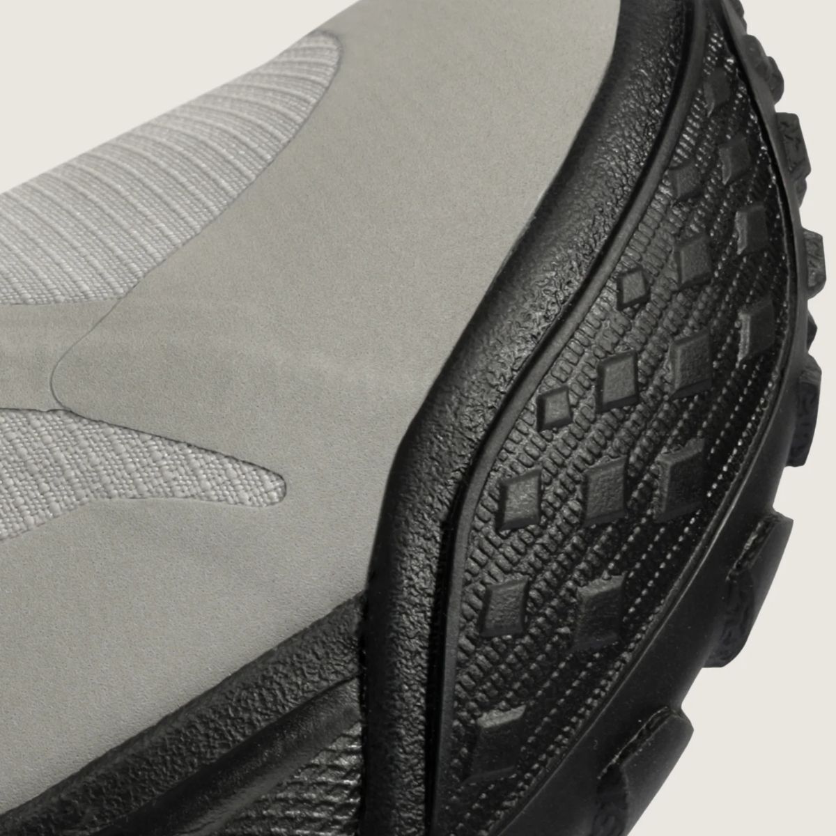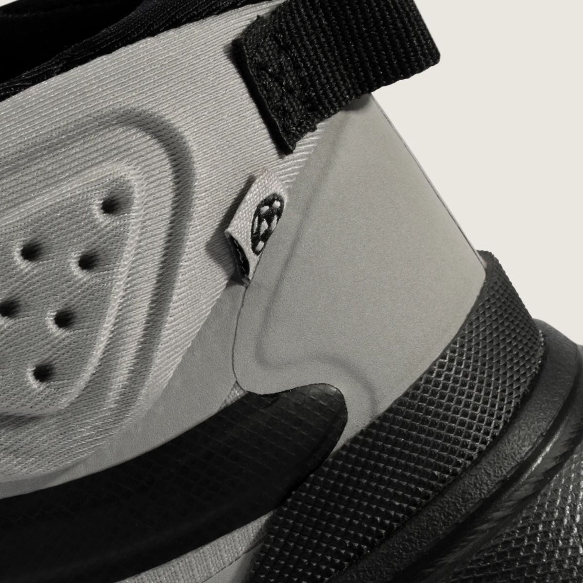 Estética “Drizzle Black”: O contraste entre o cinza claro (“Drizzle”) e o preto cria um visual utilitário moderno que esconde bem a sujeira do uso diário.