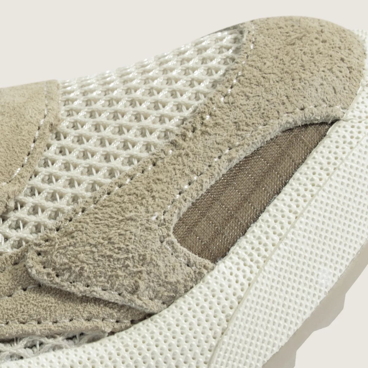 Cabedal em Materiais Premium: Combina camurça (suede) e têxteis sintéticos de alta qualidade. A cor Oatmeal proporciona um visual “clean” que esconde bem o uso diário, mantendo um aspeto premium.